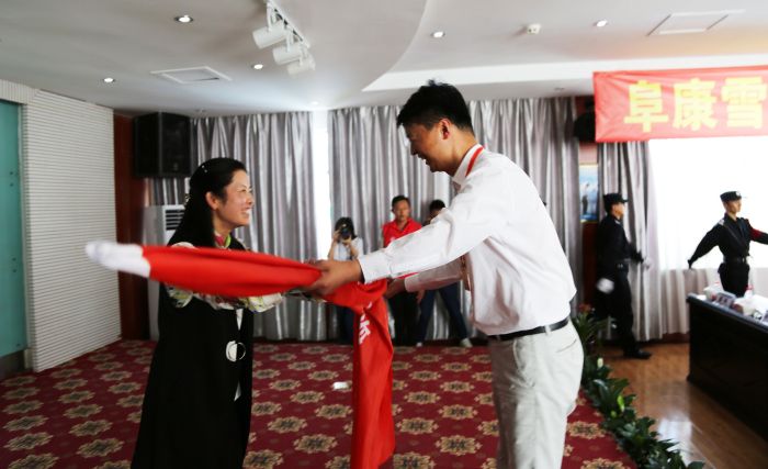西藏志愿服務聯合會副秘書長為阜康雪域天使志愿者服務隊授予隊旗